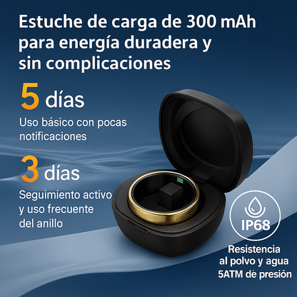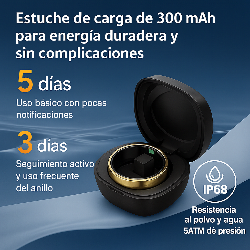 Mantén tu anillo inteligente TrackRing siempre listo con el estuche de carga de 300 mAh , diseñado para ofrecer autonomía extendida y máxima comodidad . Ideal para viajes, rutinas diarias o entrenamientos , proporciona carga rápida y segura con materiales resistentes y un diseño compacto .