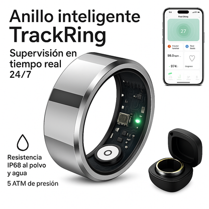 Vigila tu salud las 24 horas del día con el TrackRing , el anillo inteligente que combina elegancia y tecnología avanzada . Mide tu frecuencia cardíaca , oxígeno en sangre (SpO₂) , presión arterial , estrés y calidad del sueño en tiempo real , todo desde tu dedo.